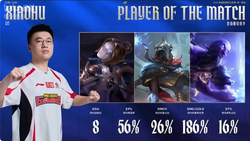 虎扑01月27日讯 千磨万击还坚劲!Xiaohu拿到WBG对阵TES比赛的全场MVP