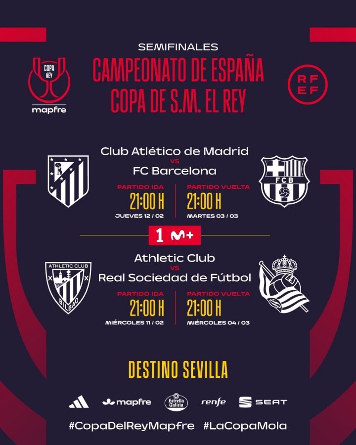 开云中国-国王杯半决赛对阵出炉!巴萨vs马竞、毕巴vs皇社,两回合决胜