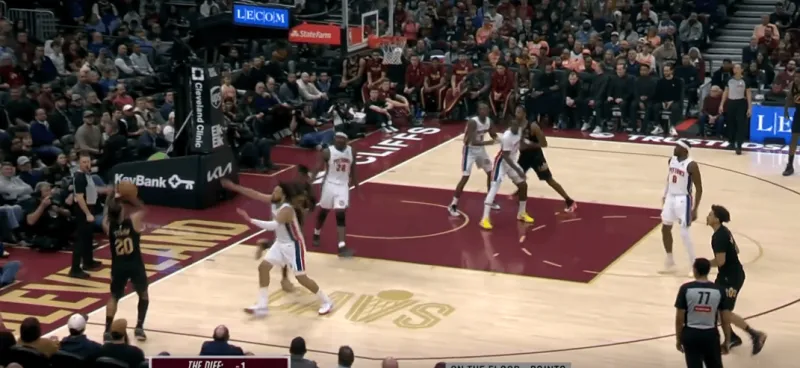 在莫布里背身单打时吸引活塞禁区的收缩,45°的泰森迅速切入接应,接球后稳稳抛投接应莫布里。
