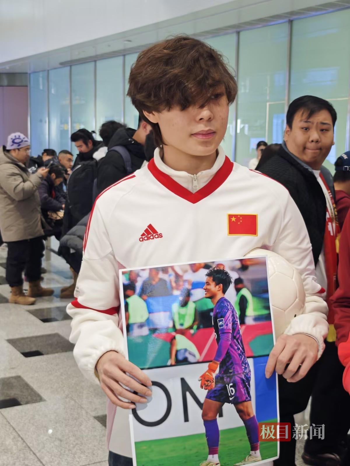 一名来自河北廊坊的球迷告诉极目新闻记者,他今天特意从廊坊赶来,这是他第一次来到北京接机,他手持门将李昊的海报来到机场,“我是李昊的球迷,他的表现我相信全国的观众都毋庸置疑。”