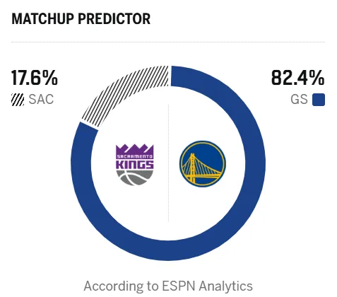 赛前,美媒ESPN预测本场比赛,勇士胜率82.4%,国王胜率17.6%。